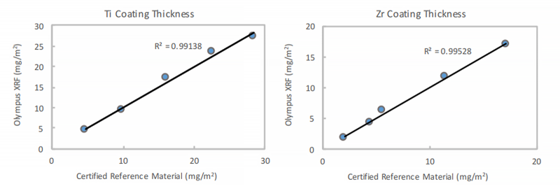 上述數(shù)據(jù)表明,使用Vanta手持式XRF分析儀獲得的鈦(Ti)、鋯(Zr)涂層厚度結(jié)果與參考材料的標定涂層厚度有非常好的相關(guān)性。
